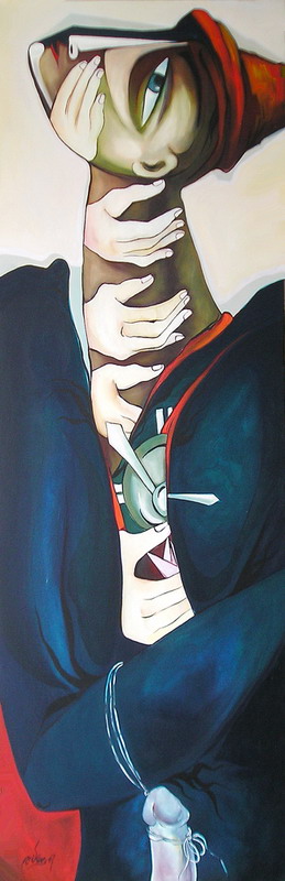 Este lienzo, «Genio y Figura», de mi amigo Humberto Viñas, pintor cubano con el que comparto memorias de ron en un malecón que ya dejó de ser pasto del tiempo, me acompaña como un sudario hasta mi último trance.