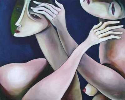 Las sensaciones se hacen realidad táctil porque las tonalidades tenues, casi transparentes, nos incitan a ir hallando caricias, rozamientos, ademanes, en definitiva, que nos identifican con esos cuerpos devorados por la angustia.
