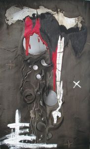 Polvo de mármol, látex, tierras naturales, acrílicos, polvo de cáscara de almendra, betún, barniz, polvo de madera blanca, negro mate, humo de imprenta y plancha de hierro, éstos son los ingredientes de lo telúrico que deja encerrados y grabados en un frente de signos que son los continentes de un delirio terrestre que no promete divisar un fin.