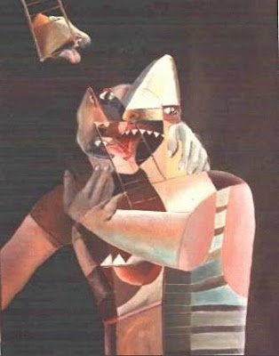 Pues estamos ante el desarrollo de una pintura de máscaras, seres deformes, apariencias antropomórficas, en las que se advierte una percepción del dominio, del poder, de una antinomia cruel de lo humano y su arquetipo, de la brutalidad de nuestro propio sufrimiento.