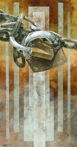 Dos recios candados aseguran un cortinaje detrás del cual flota una pleamar de silencio nuboso. La acuarela, en este instante, está surgiendo desde otras frondas distintas de las ya tópicamente habituales. Está a punto de romper esas cadenas mohosas sin que esos cerrojos puedan impedírselo a pesar de su fuerza.