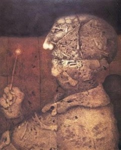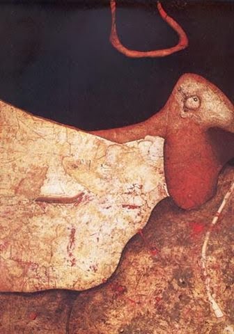 Salimos o entramos, según se prefiera, hacia otra realidad plástica trascendente y sugestiva que configura en la mirada y solamente para ella relatos oníricos y fantásticos que mitifican la vertiente bárbara de nuestra naturaleza supuestamente ambivalente.