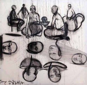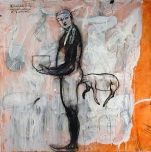 Los personajes, indefinidos y flotantes, sus cabezas, incluso los animales, componen un a modo de corte celestial hierática, en suspenso, pero como una requisitoria sin alma sobre lo mortal y perecedero. Muchos en una ocasiones o pocos en otras, gravitan sobre fondos que los esencializan en un eterno estar. Incluso las miradas que nos dirigen parecen ir más allá del marco, como indicando al espectador una realidad intranquilizadora a la que no tiene acceso.