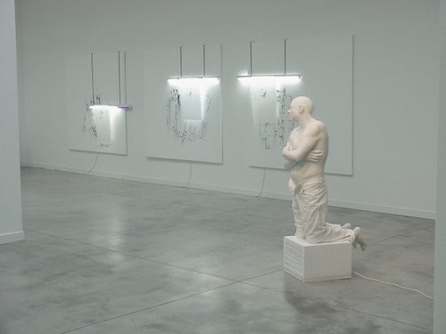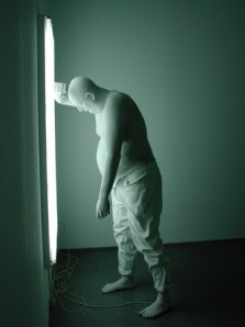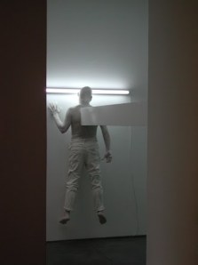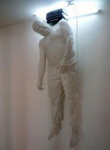 Resina de poliéster, fluorescentes, hierro, metales conforman la medida de un cuerpo humano de tamaño natural. Está preso de sus elucubraciones sobre el ser en sí, ensimismado en la simulación metafísica de su evidencia, y por esa razón se pone a prueba, se cuelga con los libros que le instruyen y le engañan, deja que un madero le atraviese y le cuelgue de la pared, se asoma a la ventana.