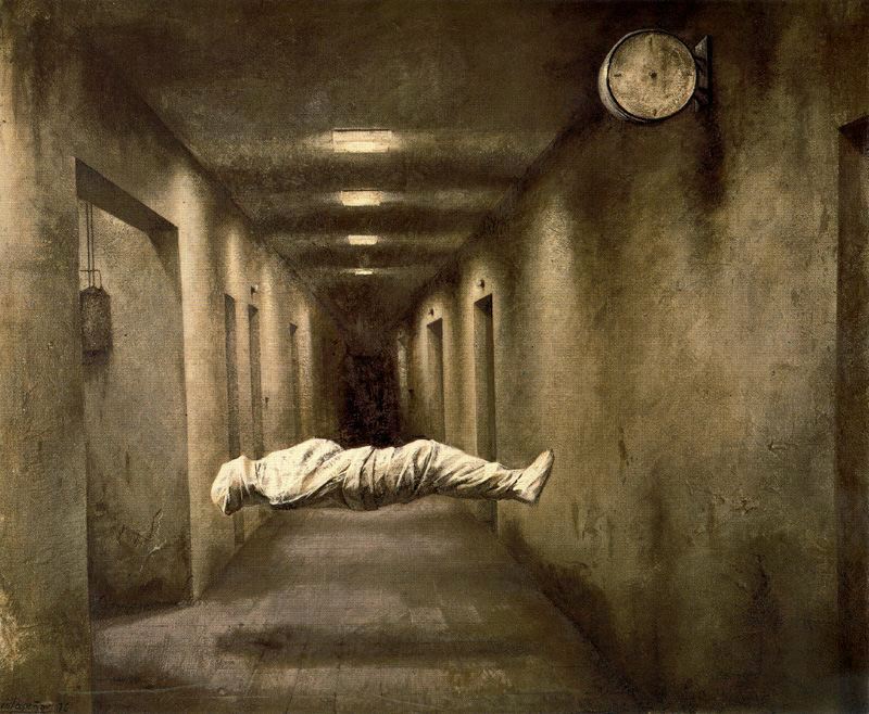 El patetismo emponzoña esos cuerpos desnudos o capaces de sostenerse en el aire gracias a su momificación (flota para no contaminarse de esa suciedad que impide la purificación), esos recintos húmedos, sombríos, carcomidos por el abandono y el paso del tiempo. Cárceles, habitaciones, pasillos degradados por un cromatismo ajustado en su manifestación más envilecida y al mismo tiempo tan diáfana como perturbadora.