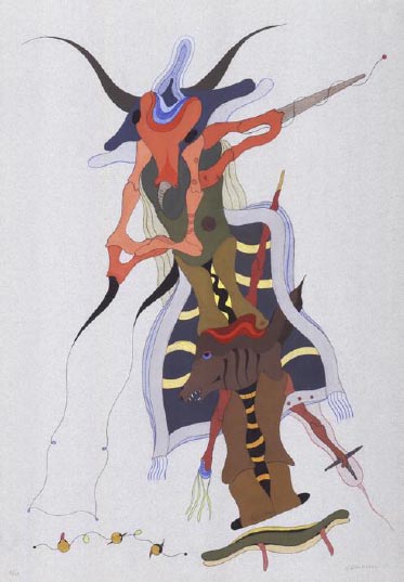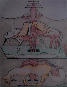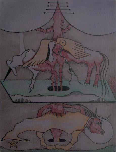 Parecen sueños elaborados con huesos, en donde la maldad solo es una máscara de juegos.Son obras que le faltan la piel, por eso no dan miedo y sí algunas de estas pinturas son algo cómicas.En estas obras conviven los perros, las cabras, los lagartos, y hasta las garras de las águilas. El gran bosque con sus pájaros voladores convertidos en animales de 4 patas. También vemos al señor cangrejo que hizo un agujero en la mar y salió a flote, a la tierra para sacrificar y comerse a una vaca. Y mientras tanto la estrellita de mar y la plata son meras espectadora que se lo pasa de fabula. Muy creativo este autor. Seguro estas obras con piel y con tonos más oscuros darían sensación de personajes macabros, pero la pintura es lo que tiene, el autor juega con ella y le da la clase de vida que quiere.Saludos