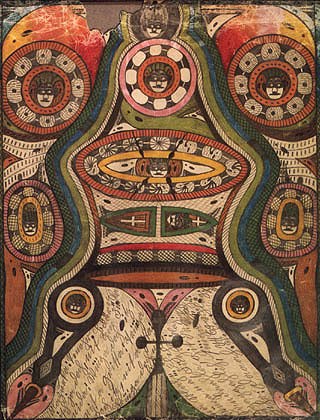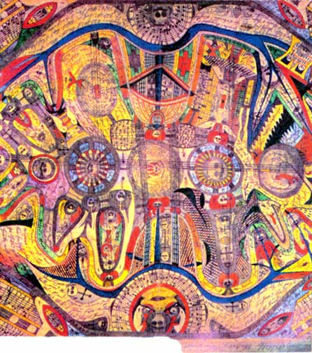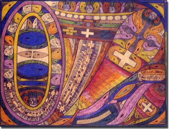Sus vericuetos pictóricos revelan la magia de lo mitológico, la plasticidad de lo funerario, religioso y mortal. Son vidrieras luminosas o como encajes polícromos y minuciosos, milimétricos e infinitesimales. Huyen de la soledad del vacío multiplicándose, difundiéndose, diseminándose, pero sin perder simetría y orden. Geometrías esféricas, onduladas, celulares, pobladas de minúsculas cabezas que se enfrentan a ojos que desconocen y quizá desaprueban.