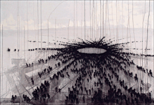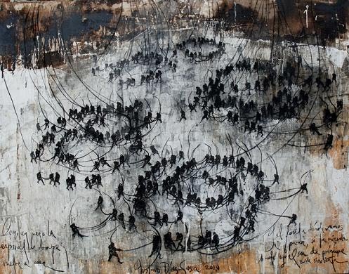 Pues lo que el cubano DÍAZ SOSA confiere al soporte es una materia isleña en que lo humano alcanza un vértigo existencial, en el que la masa es soledad caminando en busca de otra que la acompañe y tienda a esbozar con ella el horizonte de una nada.