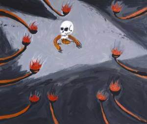 El italiano CUCCHI no es un pacificador, más bien se va de la lengua para que al plasmar los confines mortales ésta consiga engañarlos. Y de paso nos obliga, con la mirada centrada en el olor de la textura, a ver si una representación alcanza la lucidez de declinarse ante la carne a fin de que no aparezca, para que la apropiación sea ese espíritu de muerte que entre tonos vivos se agita en claros o en penumbra.