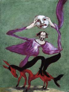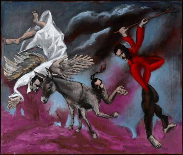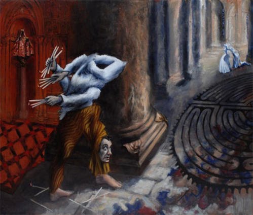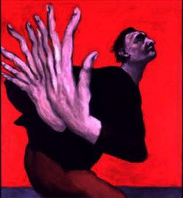 Hola Goyo, nunca te he dado las gracias por poner las obras que pones. Me gustan las críticas que haces, aunque no todas las entiendo, pero algunas de ellas si me llegan muy claras.Este autor me ha llamado la atención por como dibuja las manos. Da la sensación de que su mensaje va en caminado a la labor que pueden ejercer las manos. En nuestras manos está el poder salvar la vida de las personas. De la misma manera está el quitarles la vida. La primera obra da esa sensación, de una persona que ha sufrido al ver como unas manos sesgaban vivas o alguna vida. Es el sufrimiento de esconder las manos detrás, aunque por lo enorme de esas manos no se pueden esconder. El fondo rojo transmite violencia. La forma del cuerpo y la cara piden clemencia.La segundo obra transmite zozobra. Tormenta mental. Amasijo de lio en la cabeza. Manos que hacen de alas pero que no se pueden elevarse. Hombre testarudo como el asno que piensa con los traseros cuando algo le va mal dando coces.En una palabra, un cuadro con una tortilla mental dramatizada.La tercera obra es una especie de quijote que se quita la máscara y se ve que no está muy cuerdo. Aun así se cree un mago por encima de todo. Pero se le ve feliz de ser como es. Así creo que deberíamos de ser todos, de vez en cuando quitarnos la máscara y ver que no somos dioses ni únicos en el universoLa siguiente obra transmite ganas de trabajar y de crear, aunque con ello se tenga que romper la cabeza, y tenga que mirar desde diferentes puntos para ser creativo. Las manos siempre están deseosas y en danza para crear.Tal vez resulte ridiculo como veo las obras, pero ya he dicho en alguna otra ocasión que no soy crítica, y que tampoco tengo estudios. Pero me gusta y me entretiene, estoy más acriva.Saludos