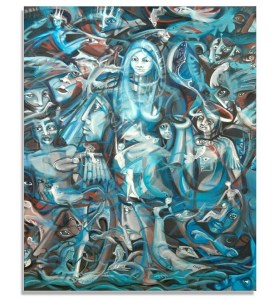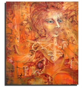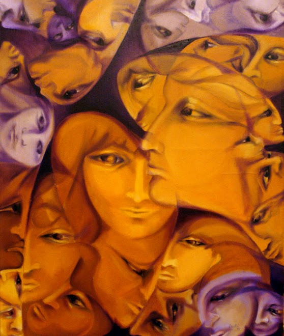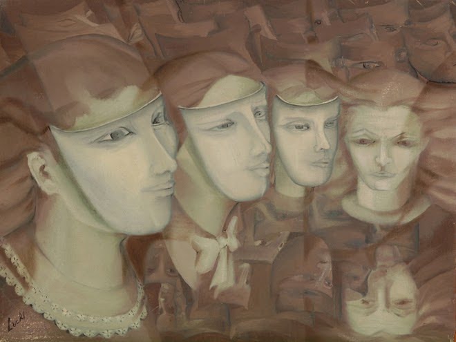 Manifiesto esta aclaración ante la obra de la argentina LUCKI porque la sed de encantamiento y reconocimiento del yo en múltiples variaciones surge de los ecos de una penumbra que se mantiene alerta, como el monólogo de una soledad vigilante aguardando a unos convidados de piedra. Incluso algunos rostros, cuya dinámica de color sensibiliza y armoniza sus enlazamientos, llevan máscaras como signo de olvido o no ser lo que fueron.