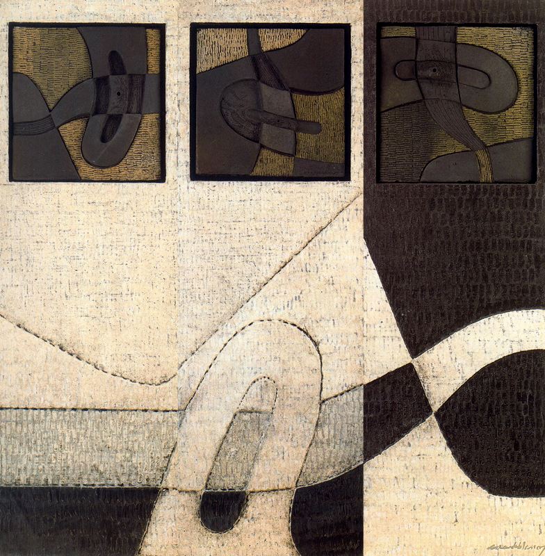 Armonía y orden de la materia coagulada, solidificada, en esas superficies, relieves y soportes que han surgido de un fondo interior remoto a constituir precisamente un diagrama exterior cuya geometría destapa la existencia de otros ámbitos creativos que el autor ha liberado.