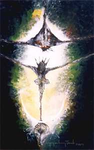 En un paseo nocturno por la ciudad de Saigón (ni los propios vietnamitas se han acostumbrado a nombrarla Ho Chi Minh) tropiezo con la obra de HUNG, artista local, casi tan afilada como la hoja de un machete del vietcong. No recibiría mayor sorpresa si me hubiesen dicho que estas furias habían emergido del fondo del delta del Mekong, que como tales eran fruto del inmutable en oposición al inconstante (adagio chino).  Sobre esa base de leyenda  se alza la formulación figurativa de una conspiración que conjura luz y sombras, esplendor y desolación. Cuando lo sagrado irrumpe en lo profano lo contamina de confabulaciones jalonadas por una verticalidad intrincada que busca la vida en el limitado soporte.Las formas grávidas de color adelgazan si se ven llenas, vuelan si se acercan al útero, revolotean y bailan si celebran el júbilo de que les vean. No descansan ni cesan en su llanto o en su asombro.