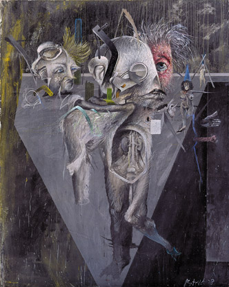 El color exacerba la forma, la forma acomete al color y ambos se intercambian mensajes después de un particular pacto. El producto sale compacto, sólido, inventándose con el secreto de una imaginería futurista, capaz de transmitirnos sones de calles rabiosas, de espacios vociferantes, de personajes en desbandada, de leyendas urbanas pintadas.