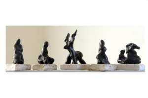 Delante de nuestras miradas se posan seres diminutos que conforman cuerpos lúdicos, curiosos, en su inmovilidad o movimiento, de la transformación operada. Después contemplamos las huellas que el rostro inmutable, pétreo, ensimismado de una figura inexistente ha grabado en un lecho vertical. ¿O son las marcas de unos entes espectrales que han emitido esas señales? ¿Por qué no preguntárselo al espécimen de raíz enroscada?