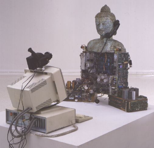 Pero los iconos orientales del pasado también le exigieron formar parte como interlocutores estéticos de una tendencia cifrada en la plástica rupturista del uso de recursos, soportes y mecanismos que relacionan y conexionan software, hadware y ordenadores con recientes vertientes culturales y económicas.