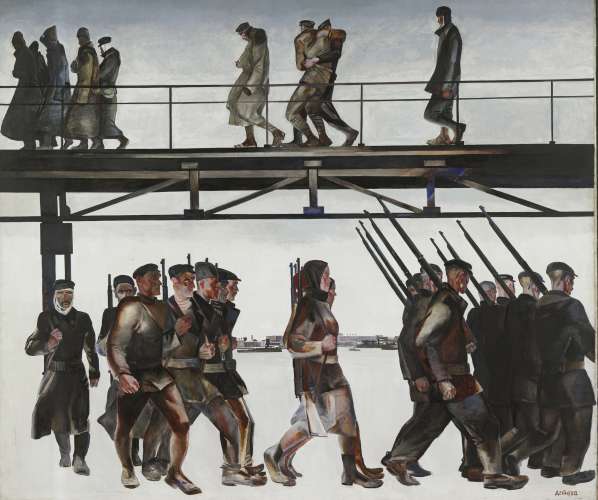 Pero el ruso DEINEKA afiló sus pinceles, tocó las húmedas superficies, movió cuerpos de héroes brillantes, tersos e hizo brotar paisajes de epopeya.