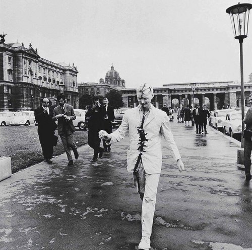 ¿Se trata, entonces, en este caso, de atreverse o no atreverse? ¿De desafiar? ¿De liberarse retando al mundo? El austriaco BRUS (accionismo vienés) se redime cubriendo su cuerpo con sus propios excrementos, orinando en un vaso y acabar bebiendo ese líquido de desecho que resulta de la acción filtrante de la sangre de los riñones y es expulsado fuera del cuerpo a través de la uretra, al mismo tiempo que entona el himno de su nación.