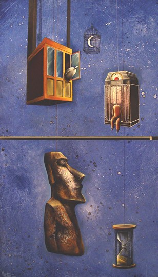 Bien es cierto que tal tesitura se produce en relación con cualquier actividad artística, mas en este caso lo incorrecto será buscar una ayuda en terrenos de lo onírico e interpretar el sentido del trabajo de este artista desde coordenadas absolutas -siempre estamos con lo relativo a «a» o lo relativo a «b»-, pues la determinación de su mecánica es fruto de una exaltación de la plasticidad imaginativa y procreativa, de la coyuntura entre una iconografía y fantasía de beatitud enardecida, de ficción y realidad negada y reivindicada.