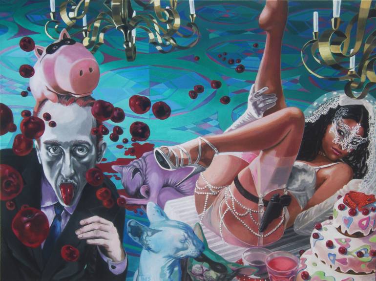 - Pero esta multiplicidad de escenarios e imaginarios nos ofrece el fruto de unos significados muy vinculados a su propia biografía y fantasía, sin negar también que hay un sarcasmo sobre los distintos roles que se manifiestan en el mundo y en su universo pictórico. Una obra pletórica de fuego e intensidad.
