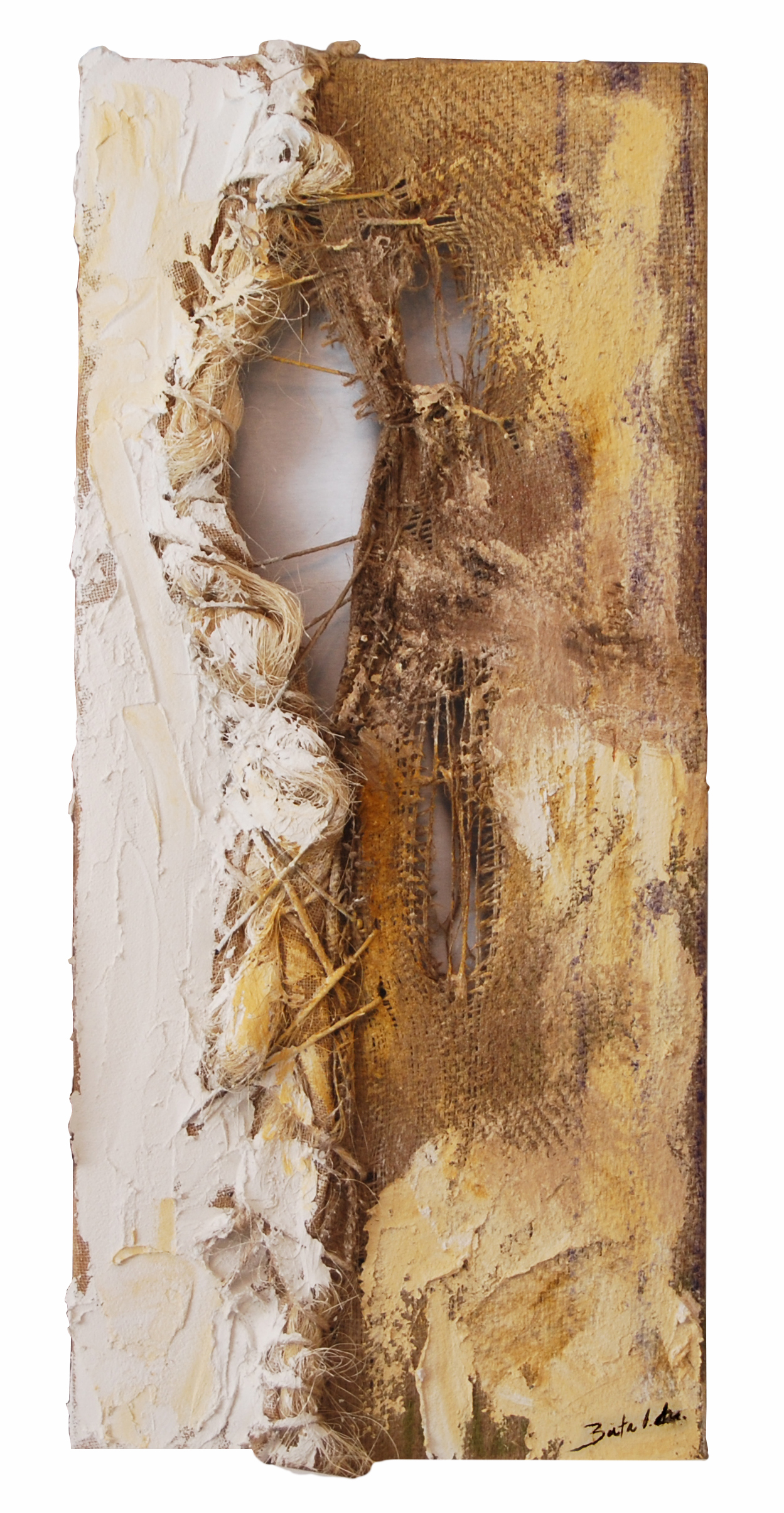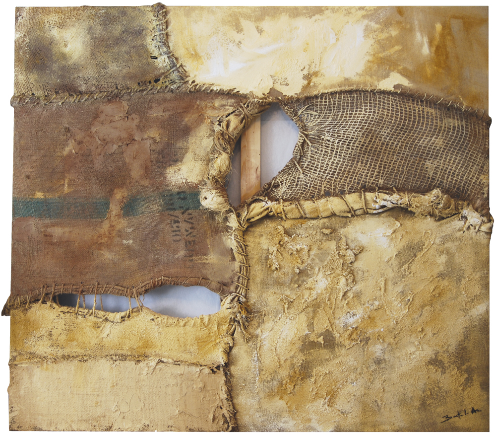 - No obstante, la española OTERO, con auténtico sentido del oficio y de lo artesanal que hay en todo proceso de elaboración de una obra de arte, procesa intuitivamente la potencialidad y significación de esa materia, ya sean arpilleras, telas, tierra, pigmentos, etc., hasta consumar la búsqueda de una epifanía que identifique visualmente el signo que nos comprende, que nos abisma o nos sublima.