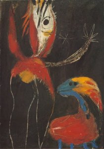 El holandés NIEUWENHUIS, artista del grupo COBRA, primero les presta el valor idiomático elemental, que denomina «bestiario», y después los pasea como la demostración palpable de un acontecer psíquico camuflado bajo parámetros plásticos.