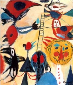 El holandés NIEUWENHUIS, artista del grupo COBRA, primero les presta el valor idiomático elemental, que denomina «bestiario», y después los pasea como la demostración palpable de un acontecer psíquico camuflado bajo parámetros plásticos.