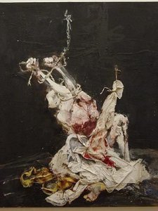 De esta figura atada y torturada que está envuelta en sábanas sangrientas y arrugadas que como sudarios cubren el cuerpo roto de lo humano, ha escapado el alma para hacer más cruel el castigo, que así ya no cuenta con un testigo pregonador de la ignominia.