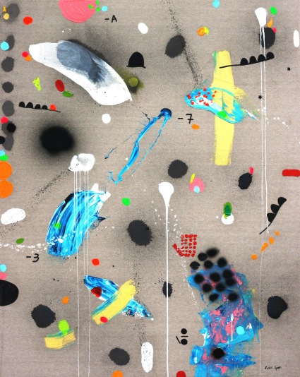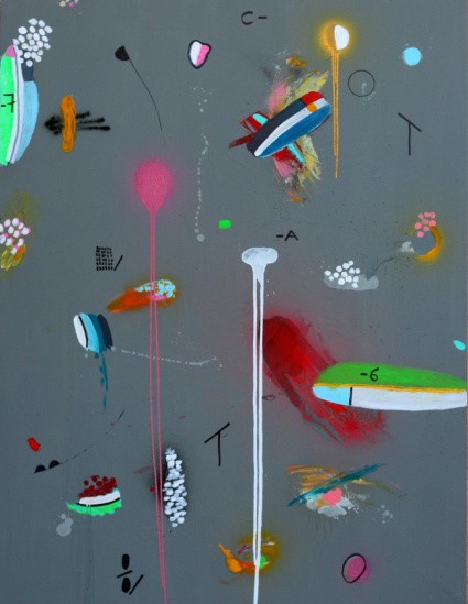- Sobre superficies planas se despliegan una variedad de motivos, signos, trazos, chorros, puntos, células, letras, números, etc., un compendio en que el artista desgrana su rosario de preguntas y escenarios plásticos.