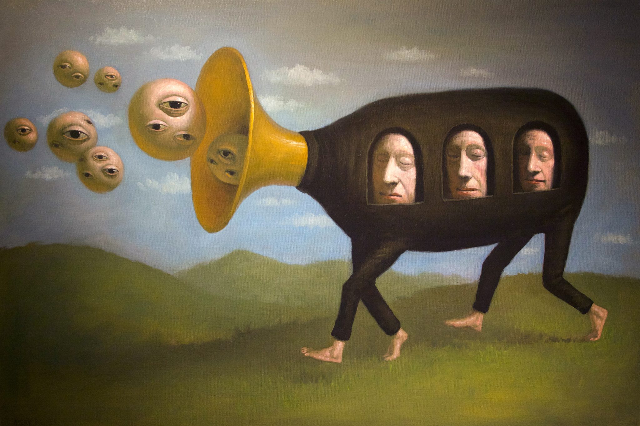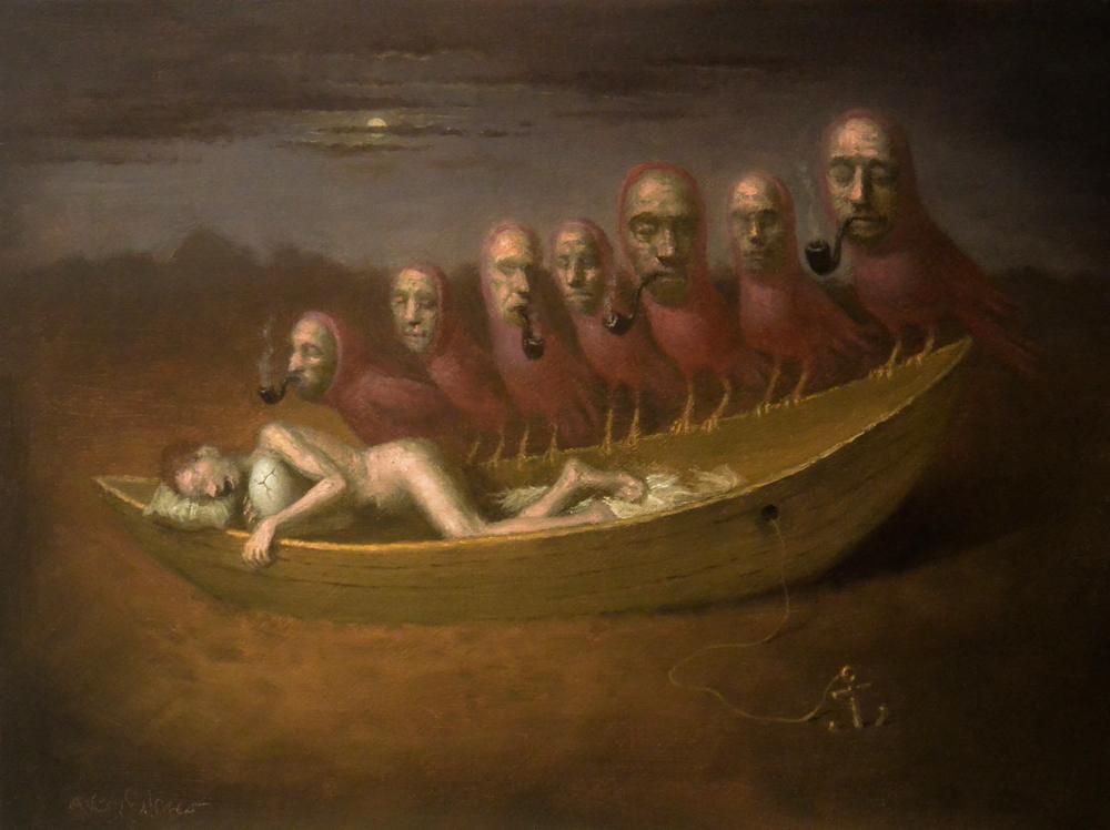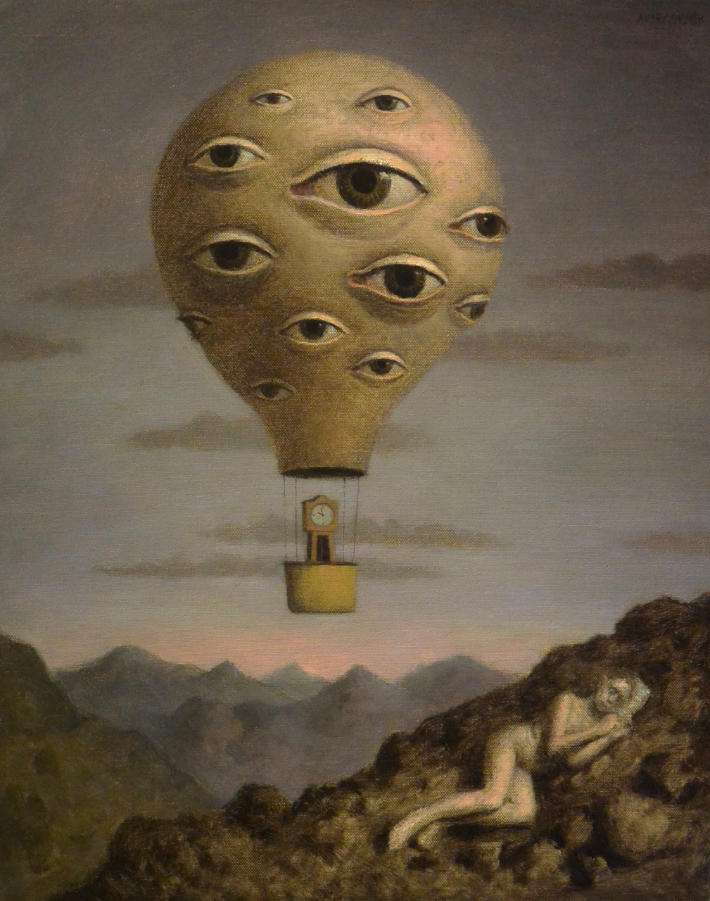 - Tantos ojos, miradas, seres enteros o dislocados, colores turbios en los que la luz está de huelga, paisajes que no cuentan nada, onirismo que no peca de salvajismo, espacios sin tiempo y no excitables quedan divagando.