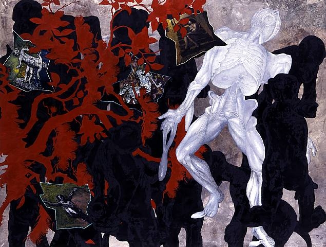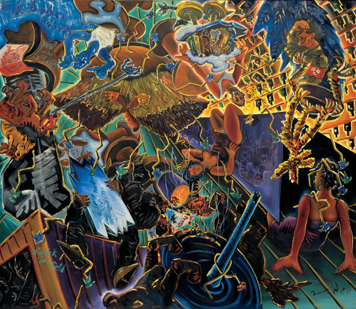 Tercero, las escenas carecen de simetrías, no se necesitan para revelar un mundo múltiple de dimensiones abigarradas, confundidas, unas superpuestas a las otras, mas con la irracionalidad simbólica del que está convencido de que la razón, si es plástica, es así, aunque nos vayamos por peteneras a cantarle a la luna.