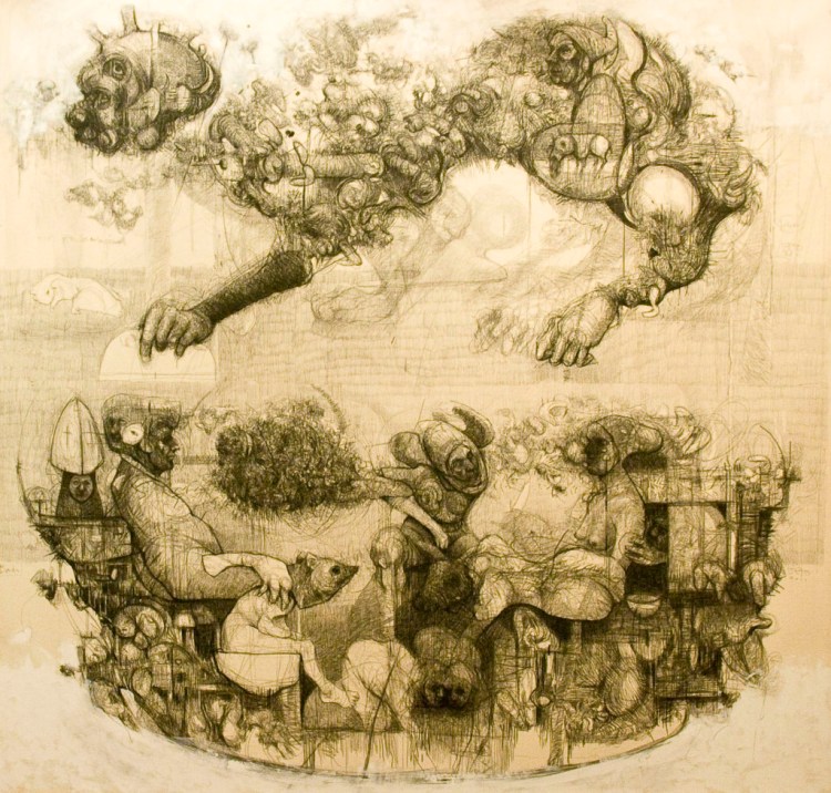 - Su estructuración espacial se desarrolla como un relato que tiene un discurso localizado en una era que desde el principio del universo viene rigiéndose por la sabiduría de un código, que únicamente el artista sabe interpretar sabiamente y lo hace con la templanza y minuciosidad del que domina el misterio de la línea y de los tonos hasta dar con esa clave plástica que ilumina…