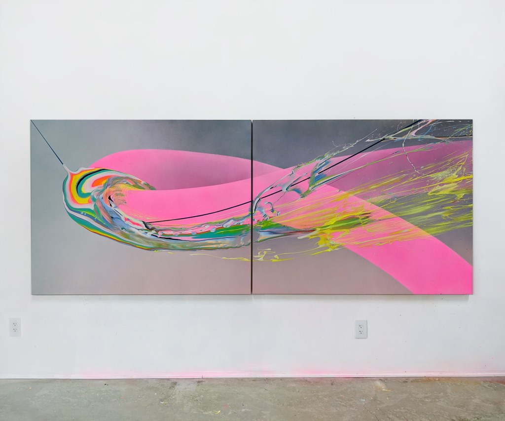 El norteamericano MINTER ha puesto un altavoz al color para que grite y o se agote en un discurso de múltiples tonos, gamas, franjas, espirales, derrames, curvaturas, órbitas, óvalos, esferas, en una licuación que tiene en su significante la cima plástica de un hacer poderoso y apasionado.