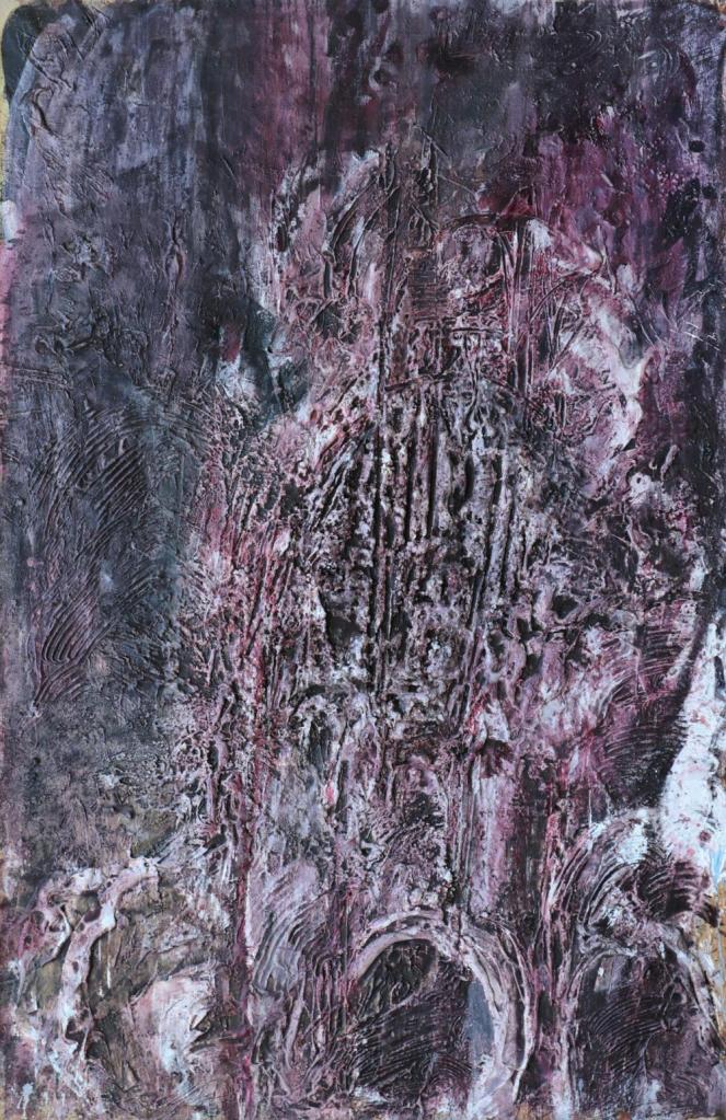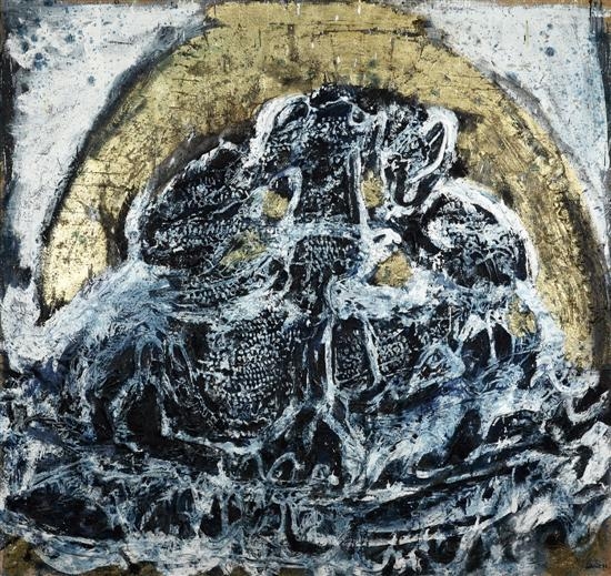 Las obras de este autorexigen un estallido y densidad que rebasen la mirada, que se ha de impregnar de esa masa ya fría, petrificada y rebosante de signos tatuados en su piel, acuchillados en sus entrañas hasta que sean señales robadas al dios tiempo.