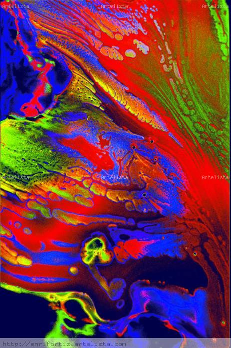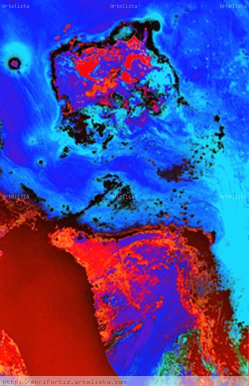 • Los fluidos cromáticos y lumínicos alumbran una superficie que mediante su penetración y absorción toma una nueva naturaleza en forma de una radiación de lava y magma, que conduce a la mirada a unas percepciones que invocan el sueño de otra realidad.