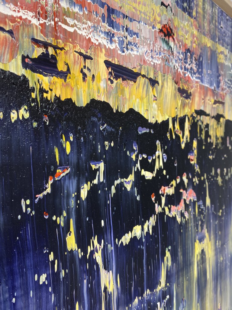 El alemán MOODY, después de darle muchas vueltas y seguir múltiples desarrollos abstractos, ha sido determinante: con esta técnica obtengo, ya sea en vertical u horizontal, que la superficie resplandezca, viva y se muestre como una realidad que solamente habla el lenguaje del color, de un color que se amalgama y no está quieto, siempre tiene que estar tiñéndose para modificar su aspecto y presentación.