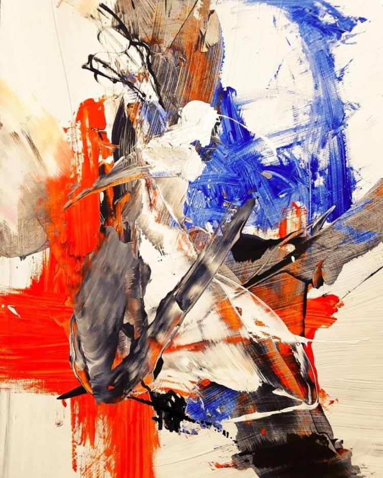 - Utiliza rodillo, pincel, brocha, como apéndices de una significación extrovertida, que amplía un cosmos que se revela con la fastuosidad resplandeciente propia de un vocabulario encendido.