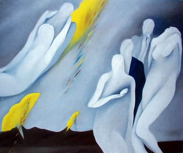 Las pátinas cromáticas se acoplan e interrelacionan con una sutil levedad que hace todavía más incorpóreas a las figuras con el fin de fraguarlas como espíritus que se encuentran y se despiden.