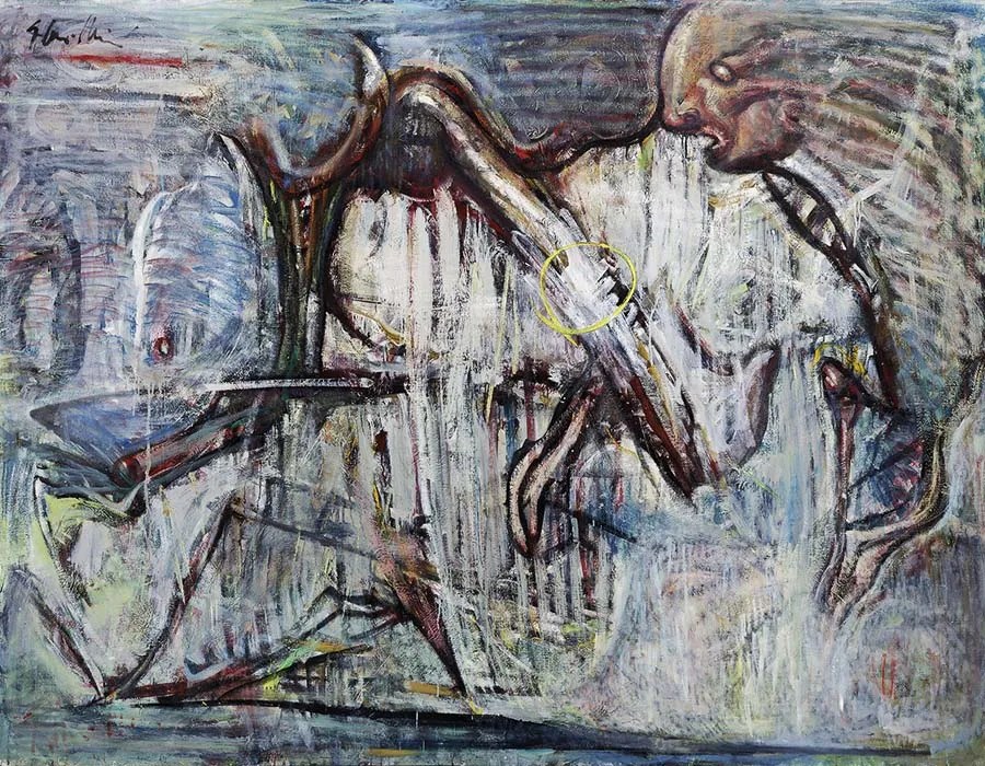 - En esa realidad de seres dinamitados no hay más fervor que los rasgos y mallas de un calado cromático tan fulgurante que la visión no creerá más que en una confabulación destructora.