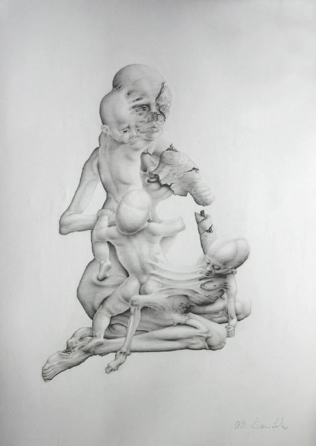 El barroco de su dibujo traza itinerarios mórbidos, depauperados, sombríos, que alimentan el claroscuro, y fagocitando una naturaleza que no se priva de señalarnos, de marcarnos lo que tiene de más cruel la falta de absoluto.
