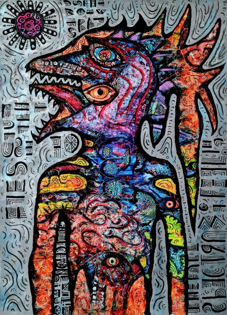 La fusión dibujo y color revela fantasías nocturnas que cuando las vemos ya son diurnas y proclaman caos y vida, o fuego y muerte. Acentúa los límites hasta que desaparecen y se vuelven espacios de galaxias indefinibles que a través suya se acercan.
