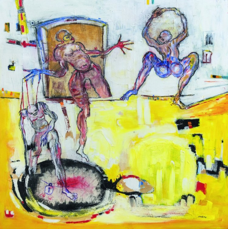 Contemplando las obras del beninés ZINKPE no nos queda duda, pues en ellas descubrimos todo un complejo ideológico y existencial surgido de un numen africano.
