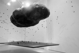 El francés de origen chino, HUANG, utiliza este mecanismo como fenómeno visual que extiende su poder de suscitar en la mente que contempla detenidamente y trata de desentrañar la alegoría que se alza en el espacio.