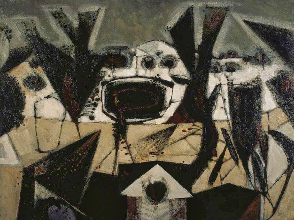Líneas esbozando geometrías, colores oscuros y terrosos, encierran en el espacio tanto paisajes enmascarados como vegetaciones que quieren abarcarlo todo como si tuviesen un destino indescifrable.