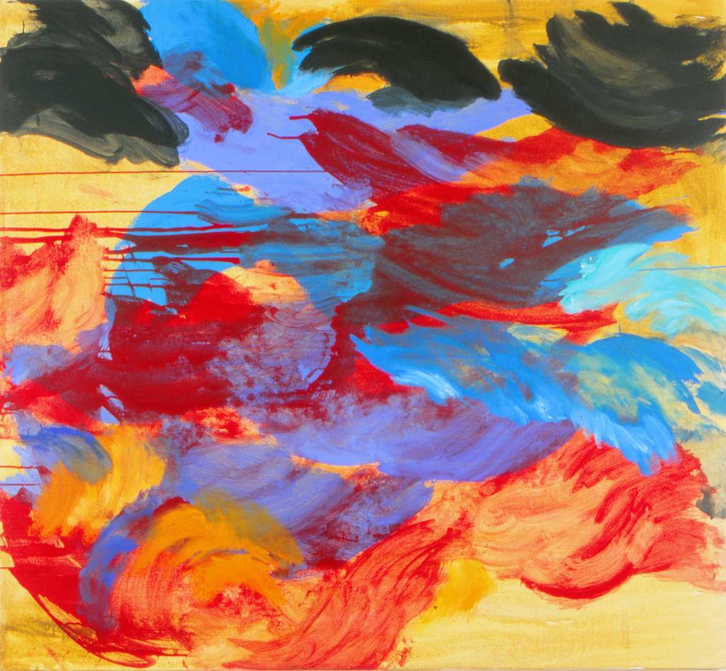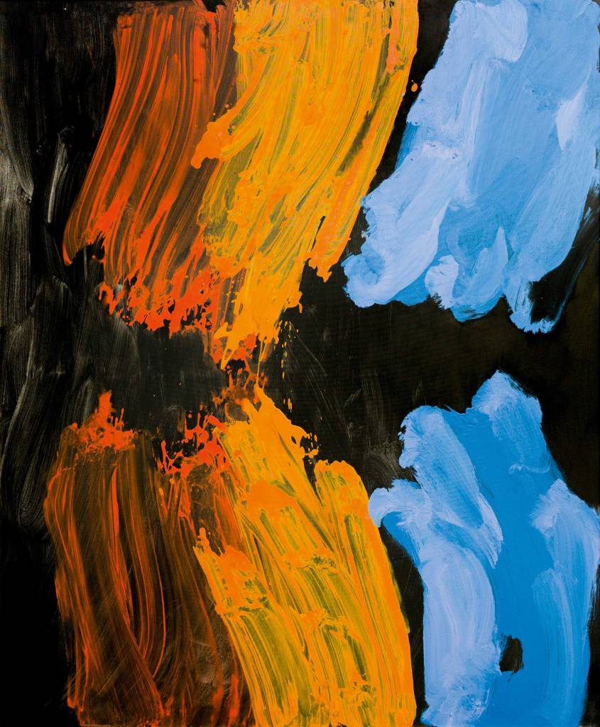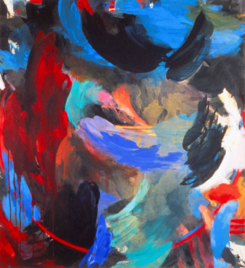La austríaca LALOUSCHEK es como si estuviese ante las paredes de una mazmorra y zarandase encima de ellas rodillos, brochas, paños, todos bañados en una espesa masa cromática, y con rabia los fustigase para que le dijeran algo sobre si esos reclusos plásticos le servirían para su libertad.