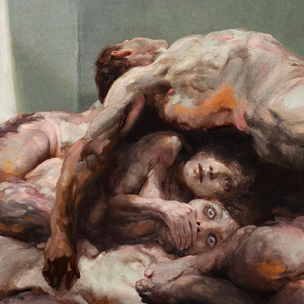 - Las obras del israelí constituyen ese éxtasis pictórico que nace de la crueldad, de la maldad, de la bestialidad, de la violencia de una humanidad que pide su extérminación a gritos, aunque salvando los textos de su legado e historia.
