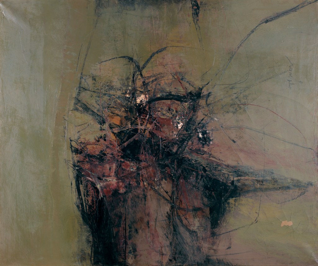 Su pathos vierte manchas, rayas, texturas, en las que el color, con toda su fuerza física y anímica, agita la superficie, la hace suya para vaticinar un futuro sombrío y descolgado de su aura.
