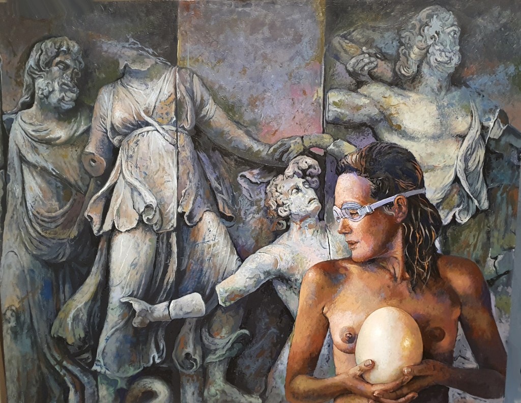 Lo que en el fondo le palpita es utilizar esa herramienta que es la plástica, en aras de una molduración en la que figuración meditabunda forme mediante la sabia aplicación cromática un relato metafísico y definitorio.