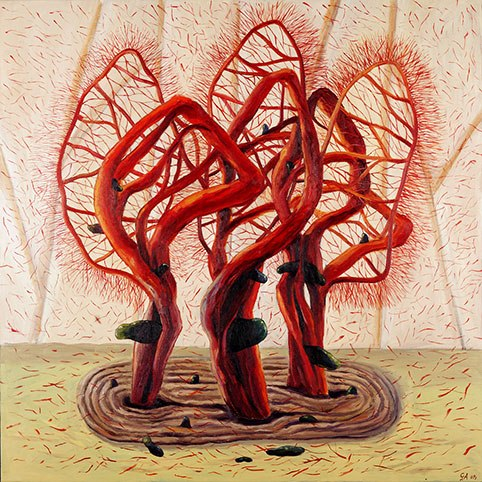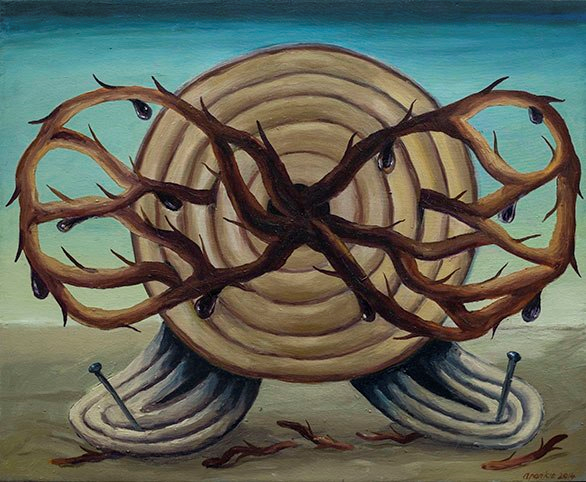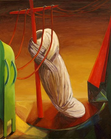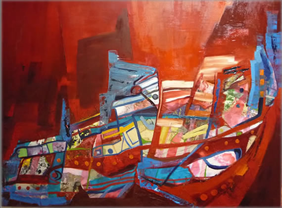Por eso TELAMAQUE oficia la ceremonia con un rito jubiloso, danzarín, alborozado, como queda de manifiesto en cada uno de sus trabajos, que, en colores planos, ensamblan elementos dispares que descubren afinidades o asociaciones plásticas en el momento que salen a la luz.