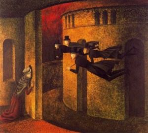Redondo el hombre, egocéntrico como un paraguas radiado en ásperos cuchillos, espera en su furioso girar clavar y desmenuzar a Dios (Alberto Vigil-Escalera).